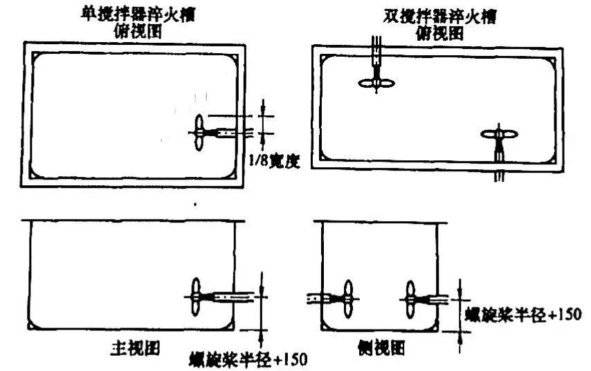 對于要求提高介質流速的淬火槽,為了防止空氣的混入,應加大頂插式螺旋槳的埋液深度或采用側插式螺旋槳攪拌。