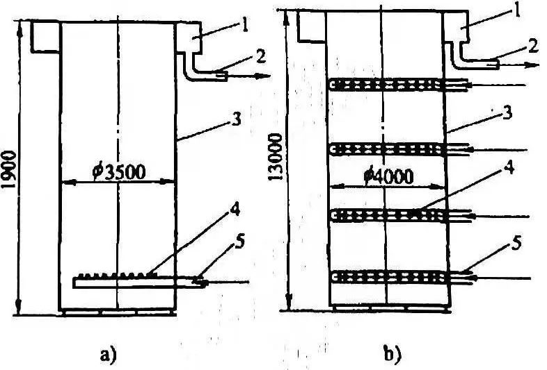 圖25 所示為采用泵攪拌的深井式淬火油槽。圖25a 所示為3.5mx19m進液管設在底部的深井式淬火槽結構形式,溢流管?325mm,進液管?219mm,泵流量為290m3/h。圖25b 為分層噴液深井式淬火槽結構形式,淬火液由幾排環形支管,沿其圓周的供液口噴射進入淬火槽,此種沿圓周噴人介質的方式,應注意防止形成環形和層狀的介質流動。