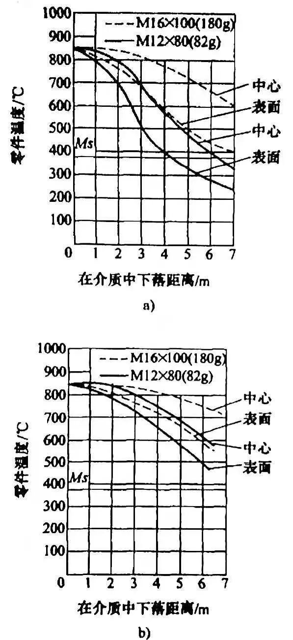 表7為不同零件下落時間的測量結果。測量的介質為:水、油I(50C下,1.6°U)和油IⅡ(50°℃C下,4.5°U),下落距離為2m。圖28 所 示為不同尺寸零件沿截面的溫度與下落距離的關系曲線。對照表9-7 與圖28 的數據可以看出,即使是尺寸小的零件在滑槽中的降溫,也未達到馬氏體轉變開始溫度。因此,在淬火件出液前提 供強烈攪拌是十分必要的措施。