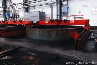 應用實例是,在多臺鐘罩式保護氣氛加熱爐生產線上配置多個淬火槽,實現柔性化熱處理。切換方式是, 淬火槽在加熱爐的下方固定不動,加熱爐在淬火槽的上方根據需要沿著導軌左右移動。