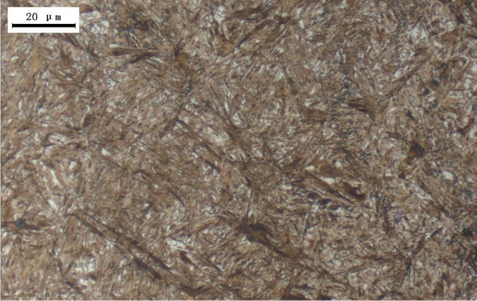(1)組織形態。試樣的顯微金相組織如圖2所示,組織為隱針馬氏體+少量鐵素體+少量殘留奧氏體。