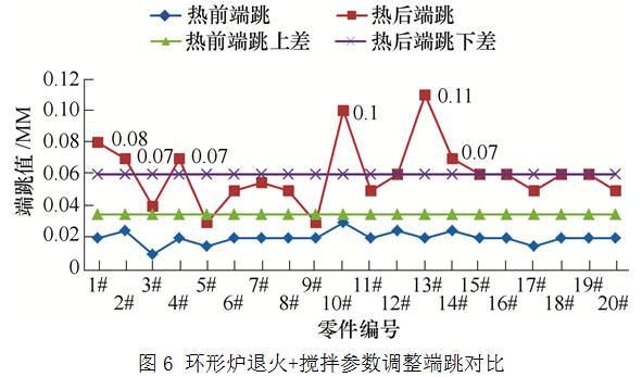 第二,使用環(huán)形爐進(jìn)行退火工序+調(diào)整淬火攪拌參數(shù):考慮到物流轉(zhuǎn)運(yùn)問題,進(jìn)一步優(yōu)化熱處理工序,在環(huán)形爐預(yù)氧化區(qū)進(jìn)行退火工序,按照退火工藝要求,在400℃保溫2h后進(jìn)入主爐滲碳,同時(shí)調(diào)整攪拌參數(shù)。零件熱處理前后端跳測(cè)量結(jié)果如圖6所示,可知熱后端跳符合工藝要求,平均熱變形端跳值為0.036mm,熱后端跳標(biāo)準(zhǔn)偏差為0.017。