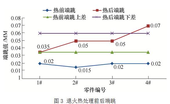 采用高溫回火爐退火,退火工藝設(shè)定為400℃保溫2h,隨爐冷卻至350℃后空冷,再進(jìn)行滲碳淬火。對(duì)熱前和熱后的端跳值進(jìn)行一一對(duì)應(yīng)測(cè)量。