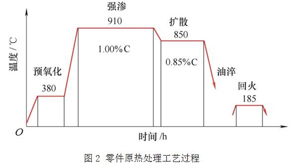 零件原先使用的熱處理設(shè)備為AICHELIN42工位環(huán)形轉(zhuǎn)底連續(xù)爐,集預(yù)氧化、滲碳、淬火、清洗、回火于一體。滲碳采用氮?dú)狻⒓状紴榛A(chǔ)氣氛,丙酮作為富化劑,按照氮—甲醇?xì)夥绽碚摚┙o比例為甲醇:氮?dú)?/span>=1L/h:1.1m3/h,CO含量值儀表設(shè)定20%。原熱處理工藝為:預(yù)氧化→滲碳→油淬→清洗、回火,工藝過程見圖2,原淬火工藝見表1。