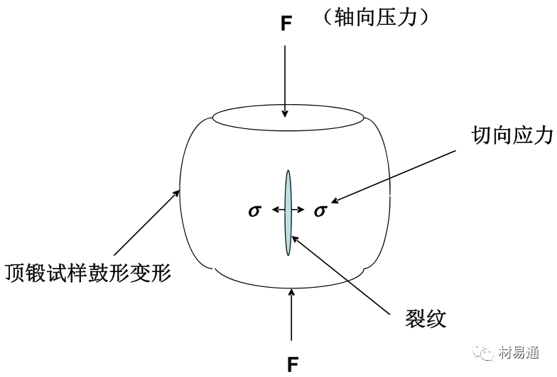 ①試樣頂鍛時(shí)易趨向變?yōu)楣男危@是由于試樣兩端面受摩擦力影響而限制了試樣橫向變形所致。