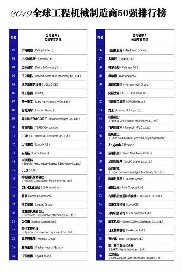 2019全球工程機械制造商50強排名前十的分別是美國卡特彼勒、日本的小松、美國迪爾、日立建機、沃爾沃建筑設備、徐工集團、三一重工、利勃海爾、斗山工程機械和特雷克斯,前十大企業占據全球市場份額超過60%。