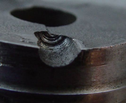 在斷頭處有一鉆孔,直徑約3.5mm,車痕較粗慥,如圖3a、3b所示。在顯微鏡下觀察斷口,鉆孔底部和曲柄的內孔之間有一厚度約為1mm的臺階,如圖3c所示。