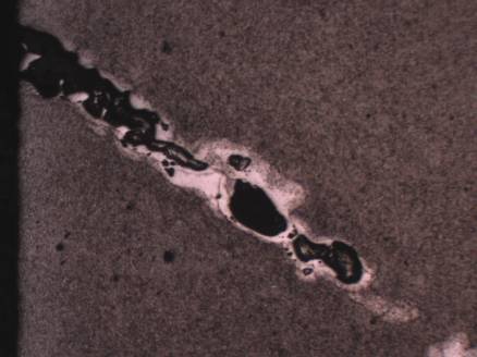 在試樣的表層存在一條細(xì)微的傾斜裂紋,裂紋兩側(cè)有較嚴(yán)重的脫碳層。裂紋間隙內(nèi)明顯可見凸出的圓弧狀晶粒自由表面,裂紋內(nèi)為斷續(xù)分布的孔洞,這是組織疏松和氣泡的特征形態(tài)。綜合以上組織特征可以斷定,該裂紋為原材料表層皮下氣泡引起的折疊裂紋(見圖5)。折疊裂紋的表層附近,有一條與工件表面垂直的微裂紋,裂紋擴(kuò)展呈周期往復(fù)的曲折狀穿晶形態(tài),這種形式的穿晶微裂紋,屬于疲勞擴(kuò)展的特征形貌(見圖6)。