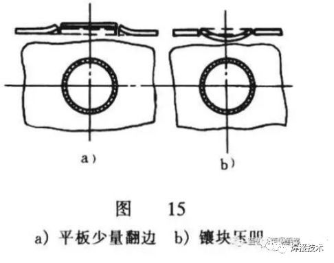 為減少焊接區(qū)域的局部剛度,可以將平板少量翻邊(圖15a),或?qū)㈣倝K壓凹(圖15b),焊接時(shí)由于焊縫能自由收縮(將平板或鑲塊拉平),使殘余應(yīng)力大為減少。