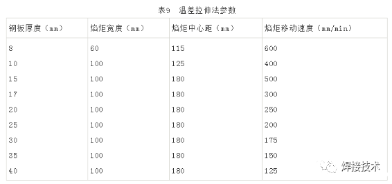 兩側(cè)金屬受熱膨脹對(duì)溫度較低的區(qū)域進(jìn)行拉伸,所以就可消除部分焊接殘余應(yīng)力,據(jù)測(cè)定,消除的效果可達(dá)50%~70%。溫差拉伸法的參數(shù),見表9。