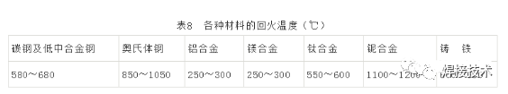 各種材料的回火溫度,見表8。含釩低合金鋼在600~620℃加回火后,塑性、韌性下降(回火脆性),回火溫度宜選550~560℃。