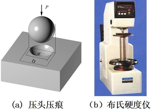 布氏硬度是用一定載荷P,將淬火鋼球壓頭壓入被測材料表面,保持一定時間后卸載,根據(jù)壓入的直徑d的壓痕面積A(圖2-12)來獲得。計算式為: