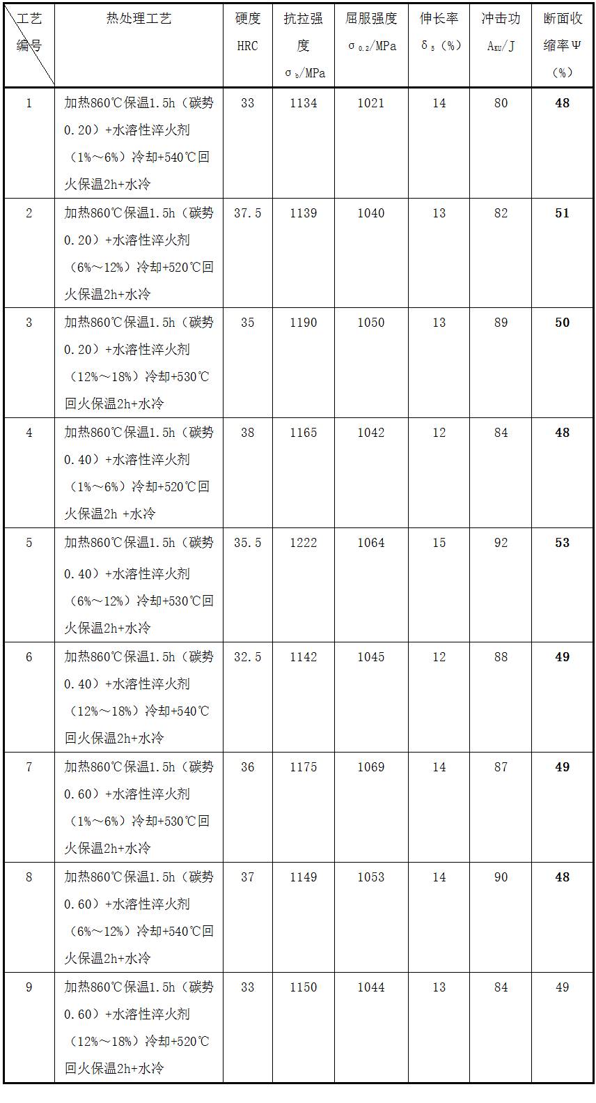 利用正交試驗設計出42CrMo鋼高強螺栓進行熱處理時的碳勢、水溶性淬火劑和回火溫度3個參數(shù)因素及其3個水平,見表2。