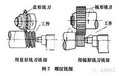 在螺紋銑床上用盤形銑刀或梳形銑刀進行銑削。盤形銑刀主要用于銑削絲桿、蝸桿等工件上的梯形外螺紋。梳形銑刀用于銑削內、外普通螺紋和錐螺紋,由于是用多刃銑刀銑削、其工作部分的長度又大于被加工螺紋的長度,故工件只需要旋轉1.25~1.5轉就可加工完成,生產率很高。螺紋銑削的螺距精度一般能達 8~9級,表面粗糙度為R5~0.63微米。這種方法適用于成批生產一般精度的螺紋工件或磨削前的粗加工。