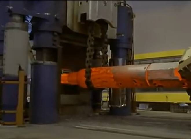 炮管經(jīng)鍛造成型后,接著進(jìn)行管內(nèi)膛的加工成型,加工方法是先用一種配用超長鉆頭的大型鉆床鉆出一個(gè)孔,接著到錘床上將這個(gè)孔逐步錘削成型。