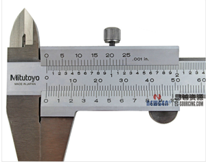 3)將上面整數和小數兩部分加起來,即為總尺寸。下圖為日本三豐游標卡尺的刻度圖