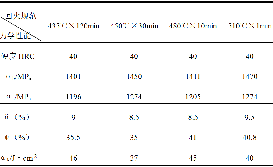 175Mn鋼(0.75%0.72%MnT8Mn)當回火參量不變時,采用不同回火溫度和保溫時間回火后的硬度和力學性能對照表。