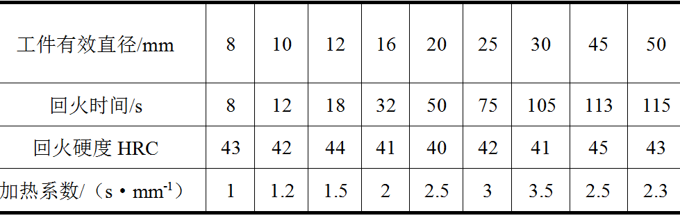 在淬火爐中進行快速回火的工藝參數與淬火件的材料、形狀尺寸、硬度要求、淬火爐型及爐溫有關,當這些已選定或為已知時,則主要工藝參數為時間,而快速加熱回火是在加熱過程中完成的回火,加熱時工件溫度的變化率和瞬時達到的溫度都對回火效果有著直接的影響。因此,不宜用加熱系數來計算快速回火的加熱時間。表3為不同直徑的45鋼淬火件,當硬度要求為40~45HRC時,在800℃鹽浴中所需的回火時間及由回火時間除以工件有效直徑所得的加熱系數。