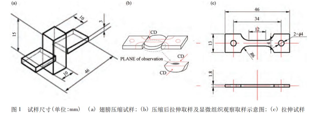實驗用鋼為真空感應(yīng)熔煉獲得 40 kg 鑄錠,化學(xué)成分 見 表 1。經(jīng) 過 1250 ℃ 保 溫 1 h 后,在 850 ~1100 ℃鍛造為 17 mm×39 mm×500 mm 的矩形方坯,鍛后正火使原始組織均勻。然后機加工成圖 1( a) 所示的翅膀試樣,在 Gleeble 1500 熱模擬試驗機上進(jìn)行多道次壓縮試驗。變形工藝如圖 2 所示。1250 ℃ 保 溫 5 min 后以 50 ℃ / s 冷卻到 1100 ℃ 后進(jìn)行第一道次變形。應(yīng)變速率為 1 / s,變形量為 0. 36。然后以10 ℃ / s冷卻到 1000 ℃ 進(jìn)行第二道次變形。依次如此直到 800 ℃進(jìn)行最后一道次變形。由于此時溫度較低,因此采用 0. 1 / s 應(yīng)變速率變形 0. 22,變形后空冷至室溫。每道次變形量的控制是通過應(yīng)變速率和時間實現(xiàn)的。變形后的試樣如圖 1( b) 所示,加工成圖 1( c) 所示的拉伸試樣,在 REGER3010 微機控制電子萬能試驗機上進(jìn)行室溫拉伸性能測試,拉伸速率為2 mm /min; 同時對變形后試樣在 200 ~ 600 ℃ 進(jìn)行回火處理,回火處理后再進(jìn)行室溫拉伸性能測試?;鼗鸸に嚰跋鄳?yīng)的室溫力學(xué)性能見表 2。為了研究變形后及回火后試樣的顯微組織,將對應(yīng)拉伸試樣標(biāo)距部分的側(cè)面組織( 圖 1b) 進(jìn)行機械研磨、電解拋光、用2% ~ 3% 的 硝 酸 酒 精 溶 液 侵 蝕。利 用 ZeissSUPERA55 掃描電鏡( SEM) 進(jìn)行組織觀察。為進(jìn)一步觀察亞微觀組織,選取部分回火工藝條件的試樣切割成 厚 度 為 0. 3 mm 的 薄 片,機械減薄到厚度為50 μm 以下,用雙噴技術(shù)獲得薄膜 TEM 試樣,利用Hitachi-800 型透射電鏡( TEM) 觀察組織變化。