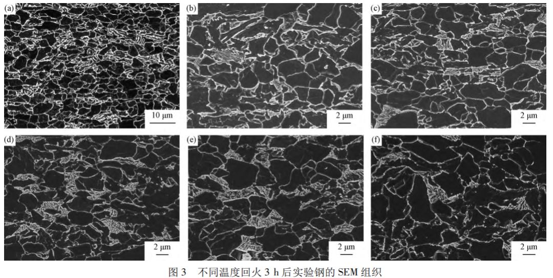 實驗鋼經(jīng)圖 所示的多道次壓縮變形后空冷得到的組織為細(xì)晶鐵素體+粒狀貝氏體組織,粒狀貝氏體以M-A 島的形式分布于鐵素體晶粒之間,如圖3a所示。經(jīng) 300 ~ 600 ℃ 不同溫度回火后,組織沒有明顯的變化仍為鐵素體+粒狀貝氏體,鐵素體晶粒尺寸略有長大,但 M-A 島在不同溫度表現(xiàn)出不同的穩(wěn)定性。在相同的 3 h 保溫時間下,經(jīng) 300 ~ 400 ℃回火后,M-A 島在數(shù)量形態(tài)、分布、大小與原始空冷態(tài)相近圖 3b,圖 3c) ,這說明低溫回火不會引起 M-A島的分解隨溫度升高到 500 ℃ ,開始有少量 M-A島發(fā)生了分解。進(jìn)一步放大觀察發(fā)現(xiàn)局部 M-A 島開始分解析出碳化物圖 4a) ,但分解速度很慢數(shù)量也較少當(dāng)溫度升高到 550 ~ 600 ℃ ,M-A 島分解明顯加快圖 4b600 ℃M-A 島已經(jīng)分解析出大量碳化,僅能觀察到少量殘留奧氏體膜并開始有碳化物粒子在鐵素體晶界析出圖 4c