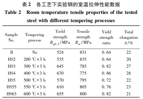 表 2 給出了不同回火工藝后的室溫拉伸性能??梢钥闯? 空冷組織具有較高的強度,屈服強度和抗拉強度分別達(dá)到了 524 MPa 和 831 MPa,屈強比只有0. 65,保持良好的塑性,伸長率 22%,具有較好的綜合力學(xué)性能。不同溫度回火后,與空冷組織室溫力學(xué)性能相比,各個溫度下屈服強度均有不同程度升高,且可大致分成 3 個區(qū)間: 200 ~ 400 ℃ 之間為第一區(qū)間,屈服 強 度 逐 漸 升 高,到 400 ℃ 回火時達(dá)到最高670 MPa; 400 ~ 500 ℃ 回火為第二區(qū)間,屈服強度開始降低,但 500 ℃時仍高于空冷組織; 回火溫度繼續(xù)升高時為第三區(qū)間,600 ℃ 時屈服強度又逐漸升高。而各個回火溫度下的抗拉強度均低于空冷組織。