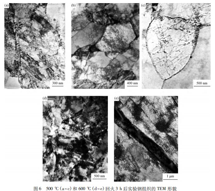 500 ℃回火時,少量 M-A 島分解,部分 BF 板條間殘留奧氏體薄膜分解析出小顆粒狀碳化物 ( 圖6a) ,但數(shù)量有限; BF 及等軸鐵素體中仍然存在較高位錯密度( 圖 6b) ,同時由于回火溫度的升高,局部區(qū)域鐵素體內(nèi)部的高密度位錯開始發(fā)生回復(fù),位錯對消重排,形成亞晶界( 圖 6c) 。溫度升高到 600 ℃ 時,雖 然 M-A 島加快分解,大量大塊的 M-A 島發(fā)生分解,在BF 基體上、BF 界面及鐵素體晶界等處析出較多不同尺寸的碳化物( 圖 6d) ,但仍然有很多 M-A 島及板條間殘留奧氏體薄膜穩(wěn)定存在( 圖 6e) 。此外,部分鐵素體基體發(fā)生回復(fù)及再結(jié)晶過程,BF 基體及等軸鐵素體中還有較高位錯密度( 圖 6e) 。