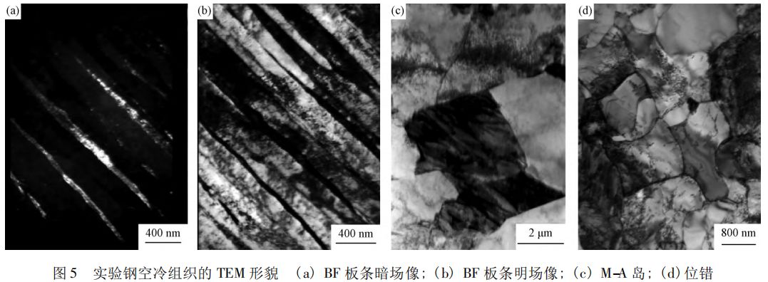 貝氏體的轉(zhuǎn)變溫度介于珠光體和馬氏體轉(zhuǎn)變溫度之間,它同時具有高溫轉(zhuǎn)變產(chǎn)物的塑韌性和低溫轉(zhuǎn)變產(chǎn)物的強度,具有良好的強韌性配合。本實驗的鋼中粒狀貝氏體是在貝氏體鐵素體基體上彌散分布著M-A 島; 貝氏體鐵素體板條具有較高的位錯密度( 圖5b) ,可起到細(xì)晶強化和位錯強化的作用; 同時由于M-A 島是硬質(zhì)相,而且這些 M-A 島是以細(xì)小彌散的方式析出,所以它們能夠與位錯發(fā)生交互作用,阻礙位錯的運動,即通過復(fù)相強化的方式提高鋼的強度。