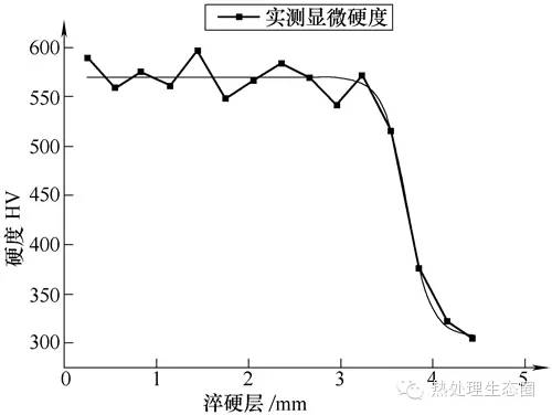 從以上檢測結果看,表面淬硬層深度、硬度、金相組織等熱處理技術指標均較好的符合技術要求的規(guī)定。由于采用沿軸向掃描淬火的感應淬火技術,所以淬火區(qū)域沒有軟帶區(qū)。使用便攜式里氏硬度計檢測實物淬火區(qū)域的硬度,均在54~56HRC,硬度均勻一致。