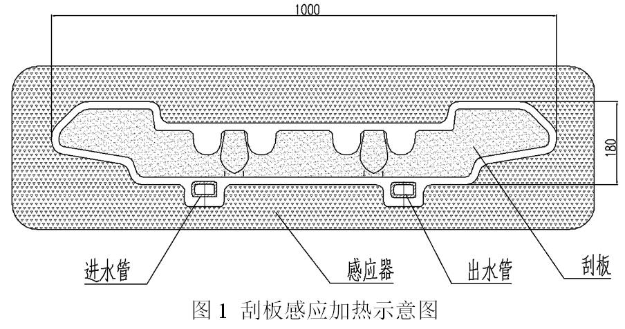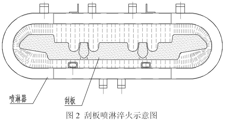 感應加熱電源使用KGPS-350可控硅中頻電源,額定功率為350kW。自制仿形感應器、淬火噴淋器和送料機構。感應器和刮板的形狀見圖 1,噴淋器的結構見圖2。當送料機構把刮板運送到感應線圈后開始加熱(圖1),加熱完成后,送料機構再把刮板送到噴淋器淬火(圖2),在噴淋器內的淬火是分段淬火的,噴淋器相對于刮板的端頭和中段的內腔是隔開的,分別由兩個泵控制其流量及噴淋時間。