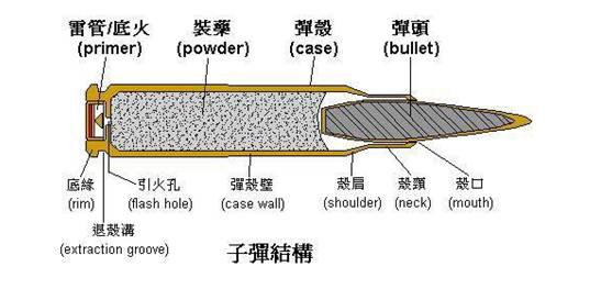 子彈由彈殼、底火、發(fā)射藥、彈頭四部分組成。發(fā)射時由撞針撞擊底火,使發(fā)射藥燃燒,產(chǎn)生氣體將彈頭推出。