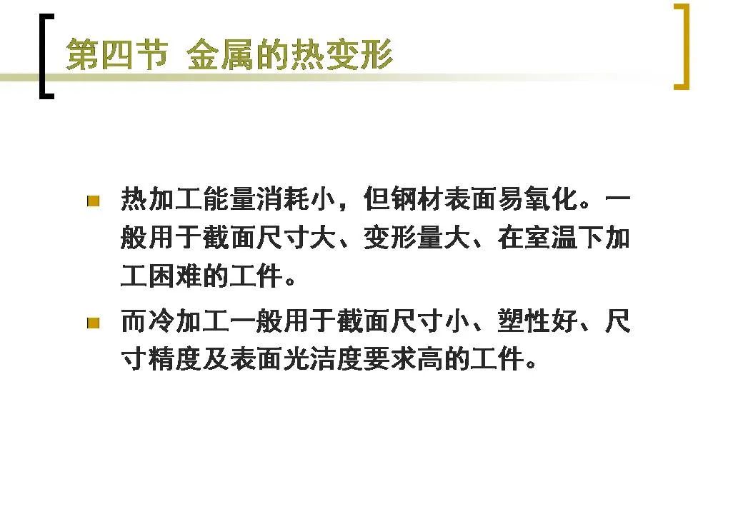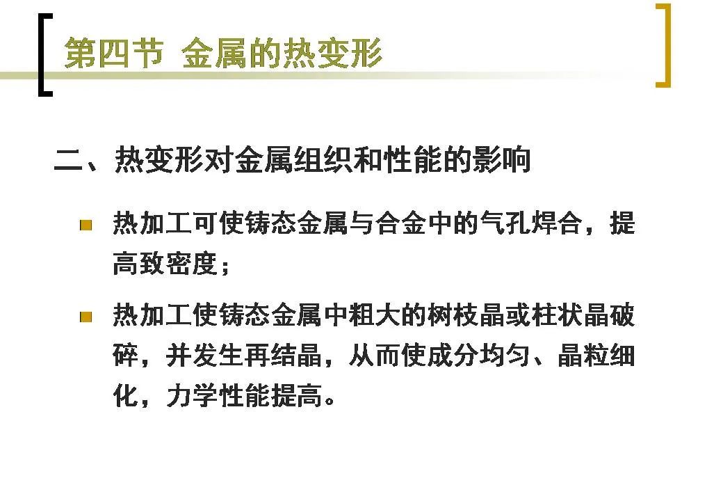 (1)由于鑄態(tài)金屬中往往具有晶粒粗大不均勻、組織不致密及雜質(zhì)偏析等缺陷,故工業(yè)上的金屬材料大多要在澆注后經(jīng)過壓力加工再予使用。
