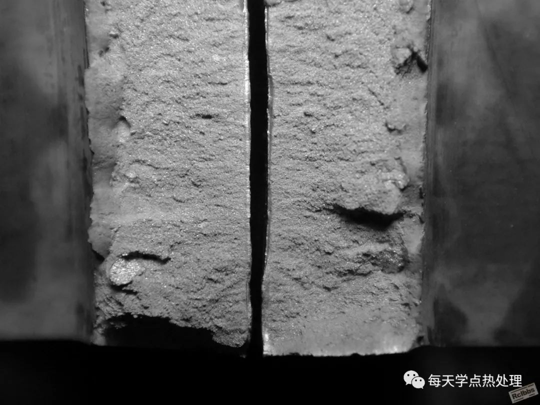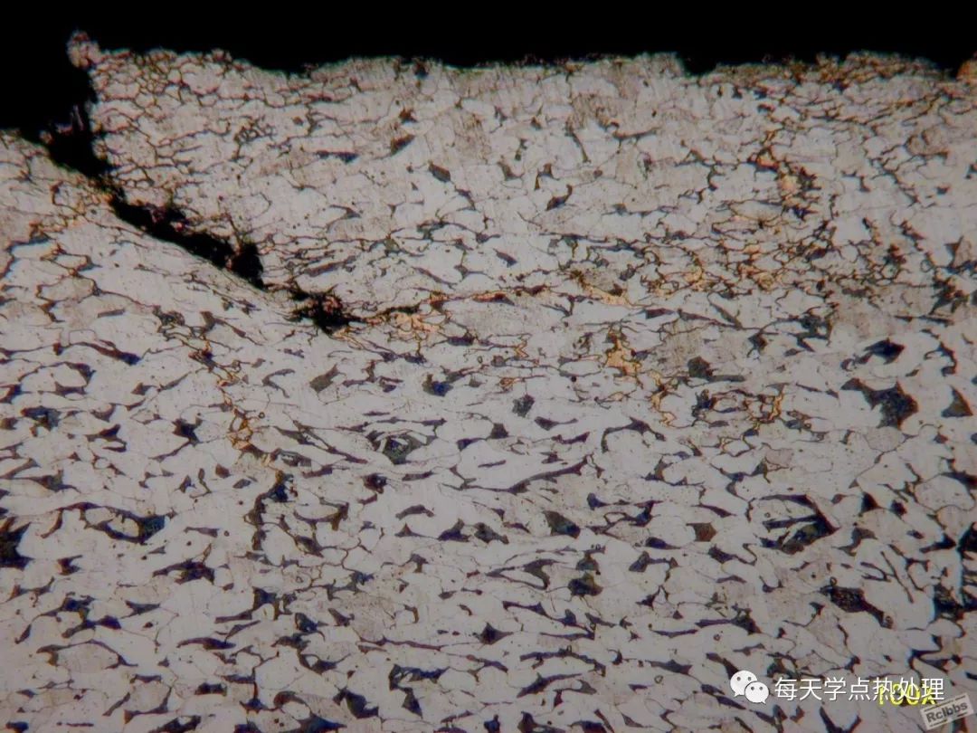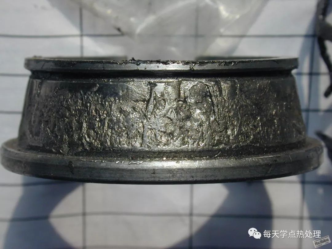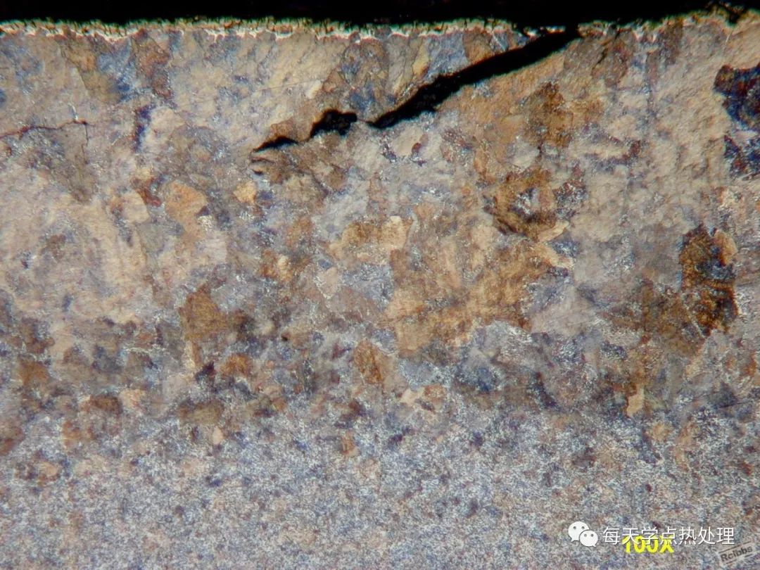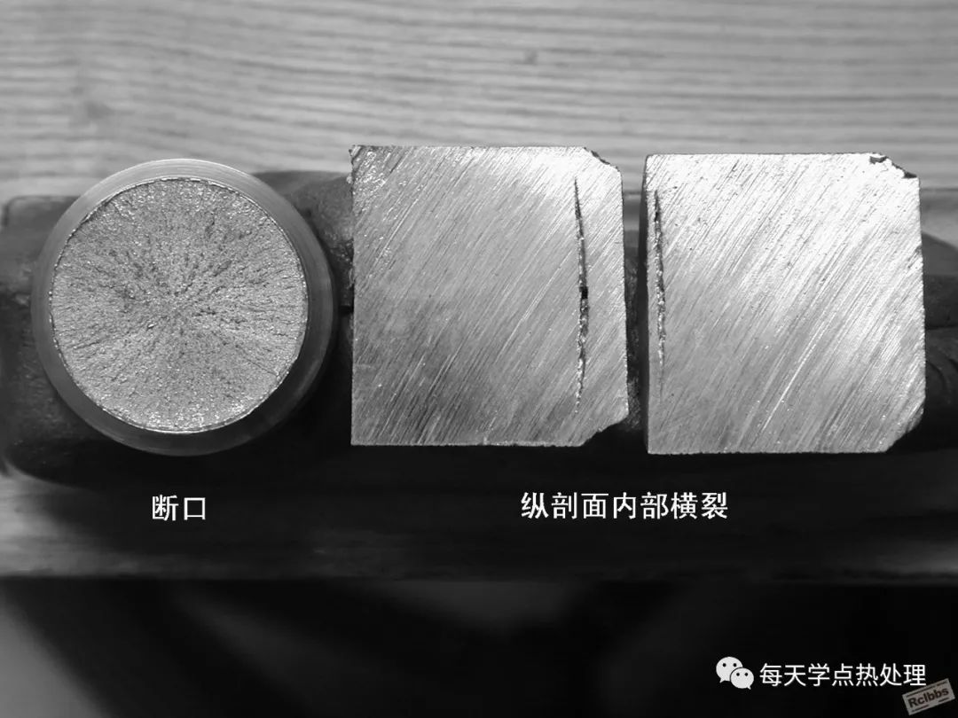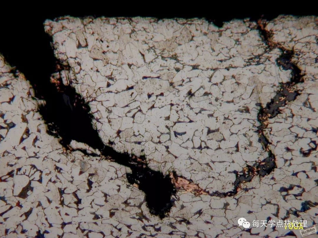 斷口上無脫碳層,有氧化色,說明是縱裂是在冷卻過程中發(fā)生的。