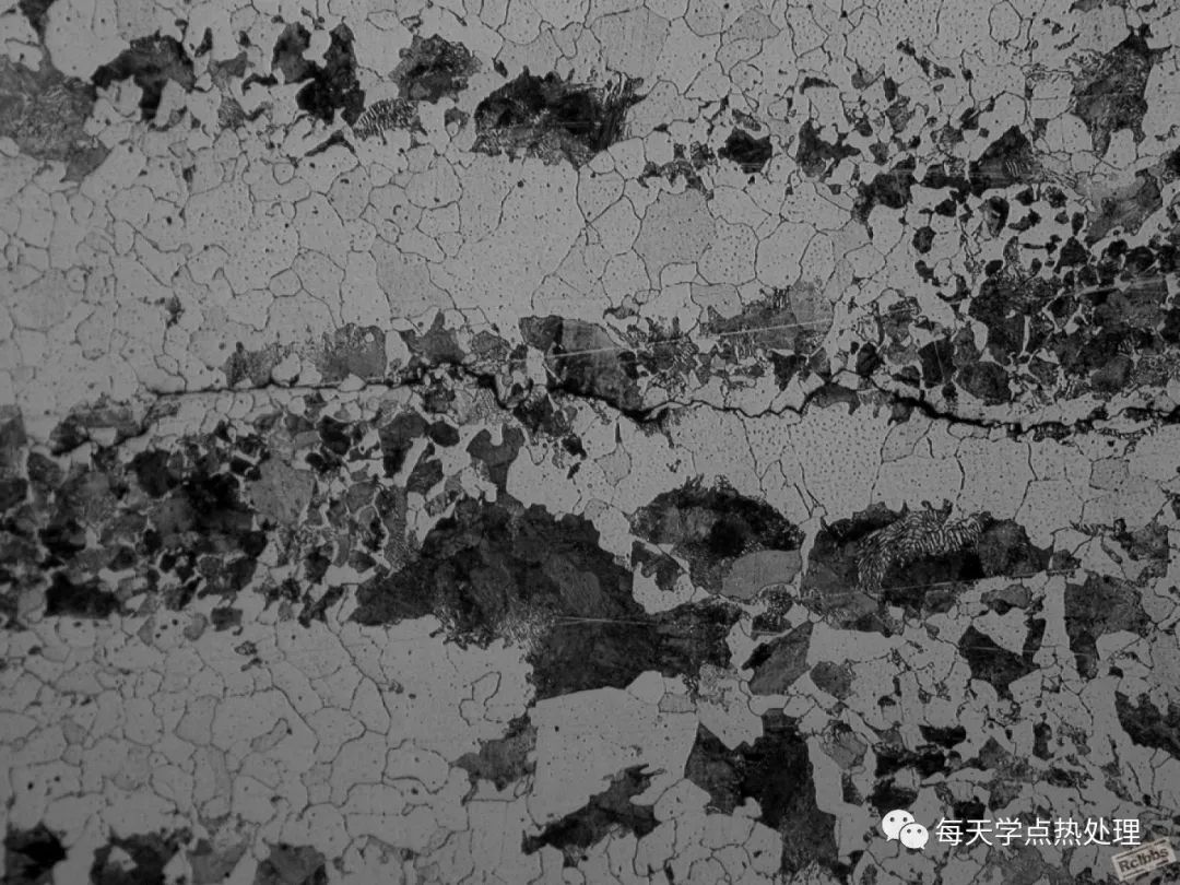 在標準圖譜或書籍上的白點,不管是低倍或斷口,都是很典型的,在工作中,我很少碰到類似的白點,特別是斷口。在白點嚴重時,超探可以對白點定性,所謂“此起彼伏”的波形。雙方的探傷人員如不能達成共識,缺陷的認定仍得由金相分析來決定。由探傷定位,在缺陷嚴重處取樣,一般是先做橫向低倍,如發(fā)現(xiàn)了內(nèi)裂,再做縱向斷口。但如果內(nèi)裂數(shù)量少,分布雜亂,做斷口時往往敲不到,要反復做,工作量很大,碰到這種情況,可用做縱向低倍來認定是否白點。當縱向低倍上的裂紋能同時滿足兩個條件:1、方向與加工流線相同;2、長度與橫向低倍相近。就可認定是白點裂紋,反之就不是。