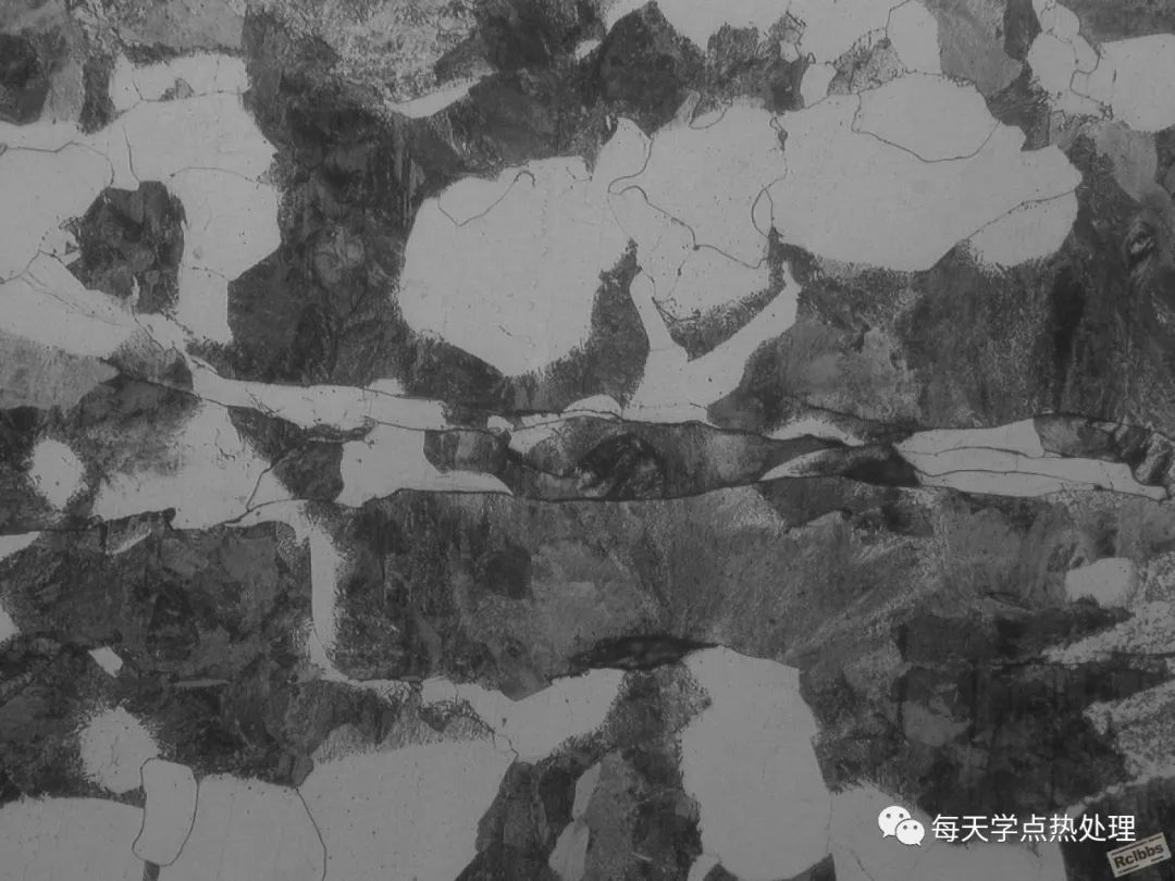 最典型的是左圖中三片疊在一起的鐵素體,這說明變形溫度已處于Ar3與Ar1之間(奧氏體+鐵素體的兩相區(qū))了。