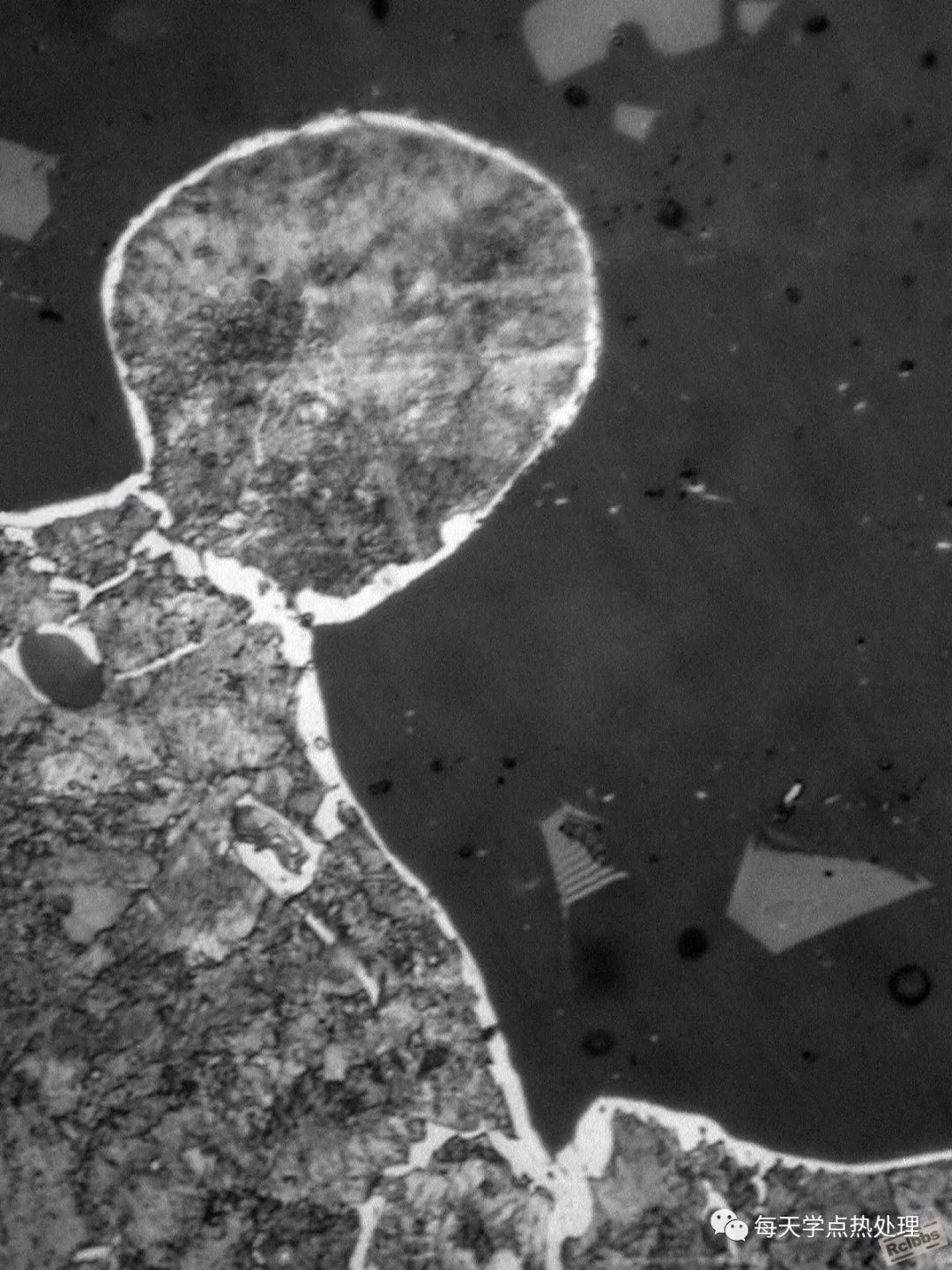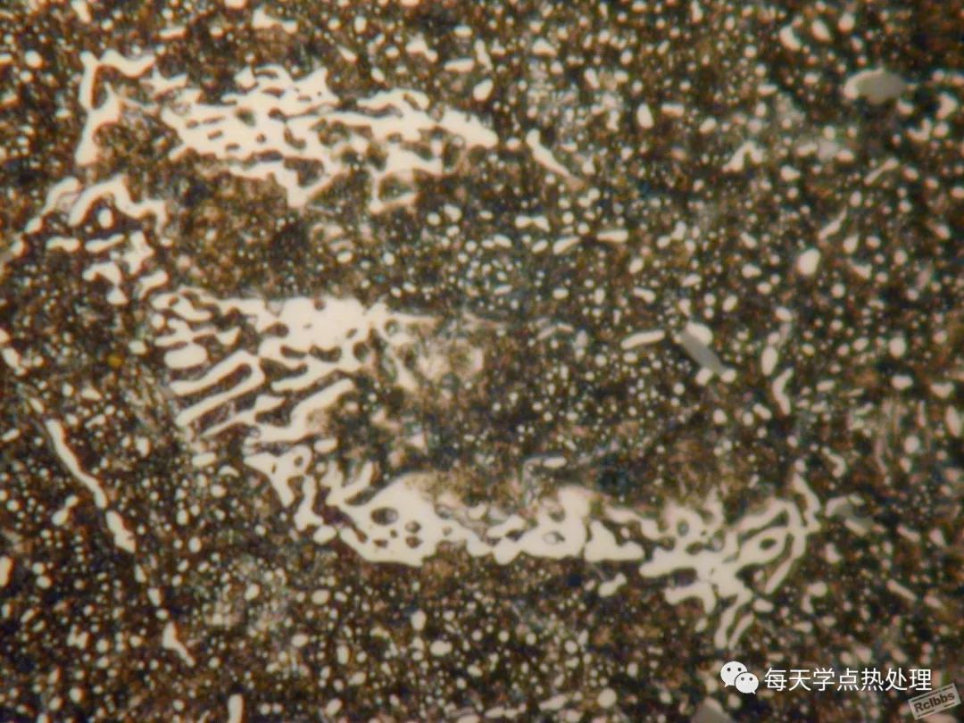 其中一件試樣還有未溶鐵素體+碳化物微區(qū),見下圖,這件試樣的硬度為HRC54.0~56.5。