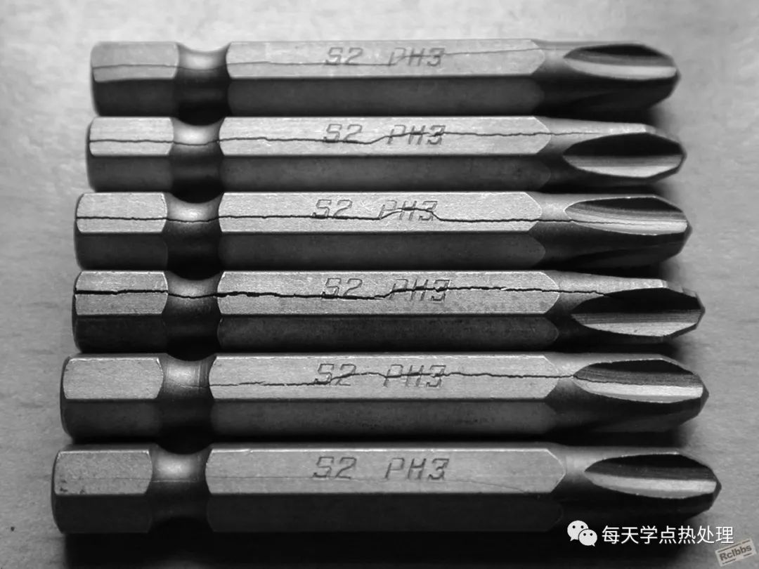 “十”字螺絲刀,原料為50CrVA冷拉六角型鋼,淬回火后發(fā)現(xiàn)開裂。淬回火組織正常。