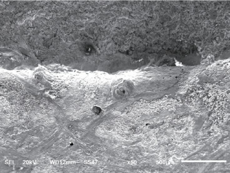 根據(jù)宏觀檢驗發(fā)現(xiàn),斷裂螺栓斷口附近銹蝕明顯,故螺栓使用環(huán)境較為潮濕,在該條件下易于氫離子附著于構(gòu)件表面,并向內(nèi)滲入引起延遲斷裂。