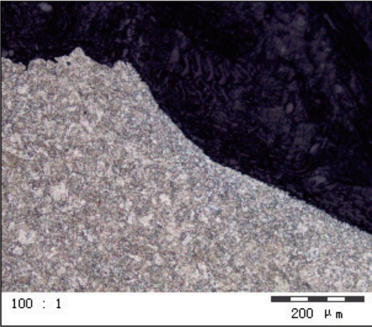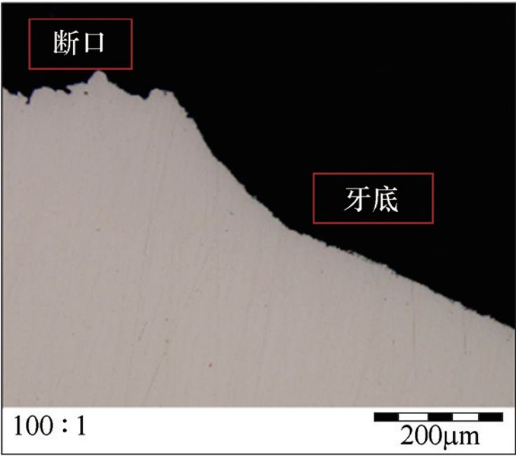 圖11、圖12為裂紋源拋光態(tài)及顯微組織形貌,從圖中可見,裂紋源部位未見明顯的非金屬夾雜物聚集,腐蝕后無明顯的熱處理缺陷。斷面以沿晶斷裂形式擴展,斷口未見脫碳及氧化特征。圖13為斷裂螺紋相鄰牙底,未見裂紋及明顯缺陷。
