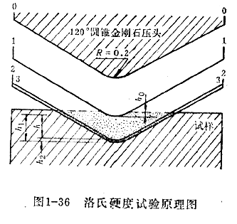 圖中0-0為金剛石壓頭沒有和試樣接觸位置,1-1為壓頭受到初載P1后壓入試樣深度為h0的位置,2-2為受到主載荷P2后壓入試樣深度為h1的位置,3-3為壓頭卸掉主載荷仍保留初載P1下的位置,由于彈性恢復(fù),壓頭位置提高了h2。此時(shí)壓頭受主載荷作用壓入深度為 h:h=h1-h2