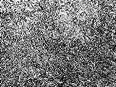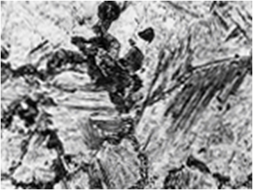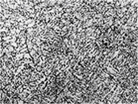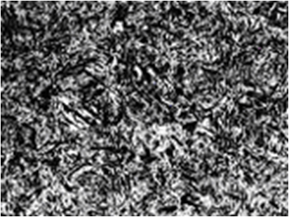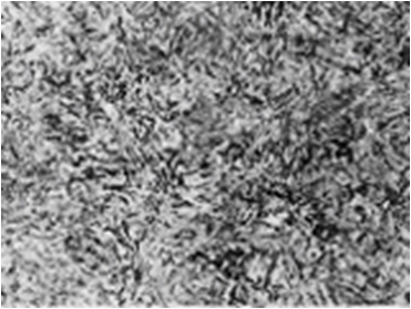 45鋼在正常加熱溫度下油淬,得到的組織是馬氏體(板條狀和針狀)+屈氏體(黑色網(wǎng)狀)+少量上貝氏體(暗灰色羽毛狀),如圖3所示。若在水中淬火可得到全部馬氏體(板條狀和針狀),但由于馬氏體很細(xì)小,在顯微鏡下不易分清其形態(tài)特征,如圖4所示。