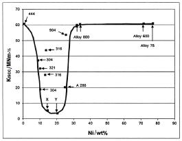 圖1 Copson 曲線顯示了在含16%~21%鉻的鐵- 鎳- 鉻合金中,鎳對應力腐蝕閾值應力強度的影響(105℃,22% NaCl 水溶液)。X 和Y 是德國高溫合金,444 是一種超純鐵素體不銹鋼。此圖根據Speidel(1981) 重新繪制。