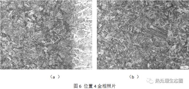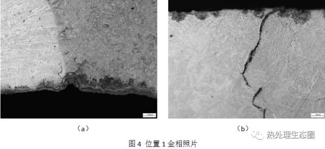 由圖5可見,在位置2處存在一條裂紋,發生于鋼背一側熱影響過熱區靠近焊縫粗晶區,大致平行于熔合線發展。該裂紋為穿晶型,裂紋末端的顯微形態是斷續分布的,為氫致裂紋特征。我們知道Q345D這種低合金高強度鋼對氫較為敏感,在工藝不當的情況下易形成氫致裂紋。同時該區域的組織為粗大的馬氏體組織,說明焊接后工件的冷卻速度較快,出現了組織淬硬現象,會在熱影響區形成較大的殘余拉應力,增大了其冷裂紋傾向,導致裂紋會在較低應力下產生。經過測量,該馬氏體區域距焊縫位置的厚度為1.7mm。