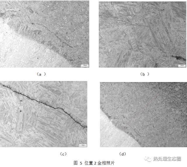 經過對位置1和位置2的裂紋的觀察與應力分析,可以判斷在焊接過程中,焊縫中有富集氫的因素,加之冷卻速度較快,在焊接殘余拉應力的作用下,殘留在焊縫中的氫回向熱影響區和母材區擴散。而且熱影響區的粗大馬氏體組織對氫脆極為敏感而發生氫致開裂,產生裂紋。同時,在馬氏體相變的組織膨脹拉應力的作用下,裂紋迅速擴展,最終導致鋼背在切除外側多余鋼板后斷裂。