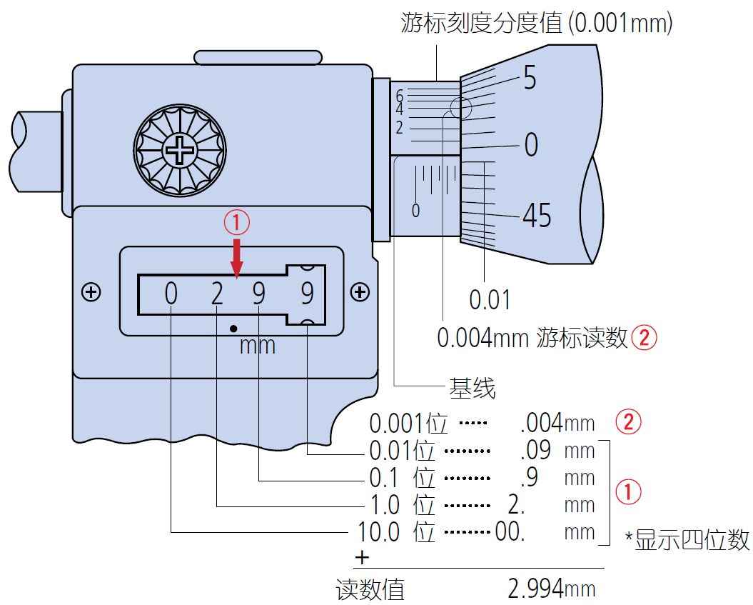 通常情況下,可以像上圖那樣讀取到分度值0.01mm,也可以像下圖所示那樣,讀取分度值到0.001mm。