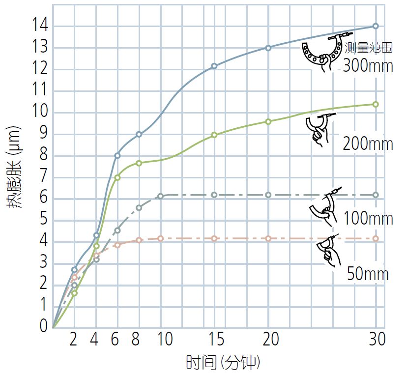 當(dāng)手持千分尺進(jìn)行測(cè)量時(shí),由于手在握住千分尺框架時(shí),會(huì)將手的熱量傳給測(cè)量工具,從而導(dǎo)致明顯的測(cè)量誤差(如下圖實(shí)驗(yàn)結(jié)果)。