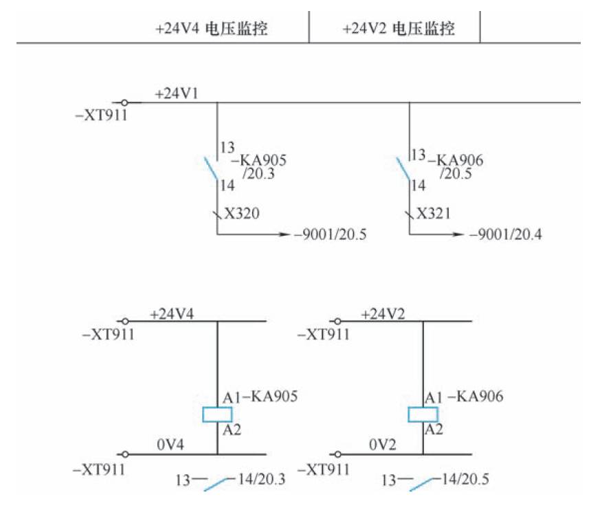 例如,北京第一機床廠生產的XKA2125數控龍門鏜銑床,有一段時期經常出現急停故障,停機后片刻就會自動恢復,而且連續出現同樣現象。分析電氣原理圖并對照PLC程序,檢查急停鏈控制電路未發現異常,在觀察機床工作狀態時,發現出現故障時繼電器KA905未吸合,而KA905是監控24V4電源的(見圖1),正常情況下應該是吸合狀態,其常開觸點為PLC輸入I32.0,PLC程序未檢測到其輸入信號而觸發系統報警。然而過幾分鐘后KA905又自動吸合,報警消失。此現象反復出現,繼而連續測量24V4電源輸出電壓,發現電源正常工作一段時間后就無輸出電壓了。進一步檢查供電電源,發現其表面溫度很高,判斷有可能當溫升到一定程度其電源內部自身的保護電路動作,關斷輸出電壓,避免因溫度過高而燒毀電源。故將電源拆下打開檢查,發現其內部散熱風扇損壞,終于發現問題所在,更換風扇后故障排除。