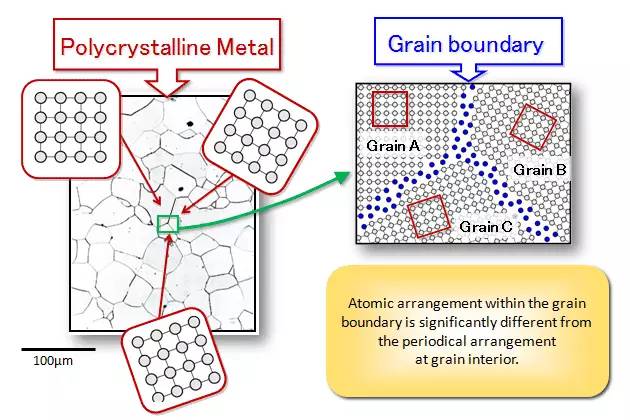 實際使用的金屬是由許多晶粒組成的,又叫多晶體。每一晶粒相當于一個單晶體,晶粒內的原子的排列是相同的,但不同晶粒的原子排列的位向是不同的。晶粒之間的界面稱為晶界。