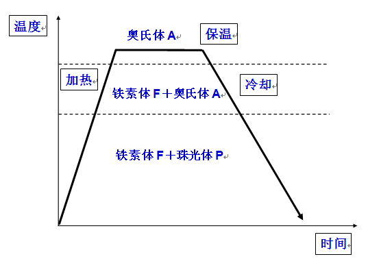 常溫組織系F+P,加熱溫度超過AC1,珠光體P向奧氏體A的轉變,繼續加熱,剩余鐵素體F向奧氏體A溶解,直至組織為單一奧氏體A。