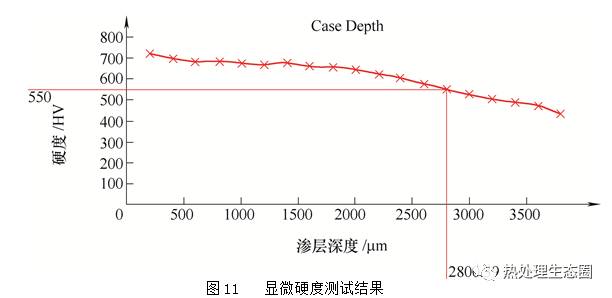檢查發現,齒輪的有效硬化層深度出現異常。熱處理工藝要求1.8mm(1.7~2.1mm),實際檢驗實物齒輪有效硬化層深度2.8mm,如圖11所示。超出工藝要求0.7mm。