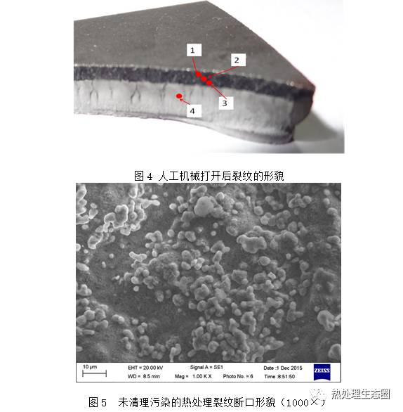 將裂紋斷口人工機械打開,如圖4所示。對斷口進行電鏡觀察,裂紋斷口有污染物如圖5所示,經過清理后,電鏡觀察其斷口形貌,其觀察點1、2、3、4的部位如圖4所示。其中觀察點1、2、3位于熱處理裂紋區-深色區,相應的斷口形貌如圖6、圖7、圖8所示;觀察點4位于靜斷區-淺色區,相應的斷口形貌如圖9所示。
